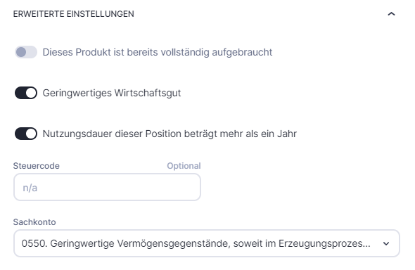 1. Ausfüllen der Informationen für die korrekte Buchführung. Je nach dem gewählten allgemeinen Produkt werden die Buchhaltungsoptionen automatisch ausgewählt.