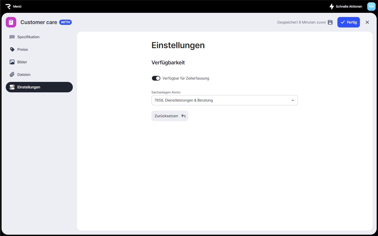Hier kannst du angeben, ob die Dienstleistung für die Zeiterfassung verfügbar ist, und das Sachanlagen-Konto für die interne Verwendung ändern.