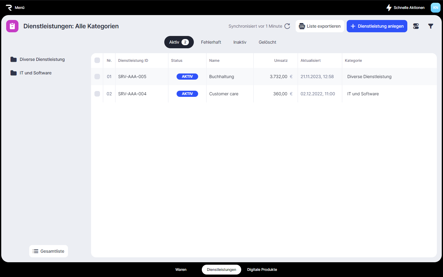 Hier findest du aktive Dienstleistungen, die zur Auswahl in Dokumenten zur Verfügung stehen.