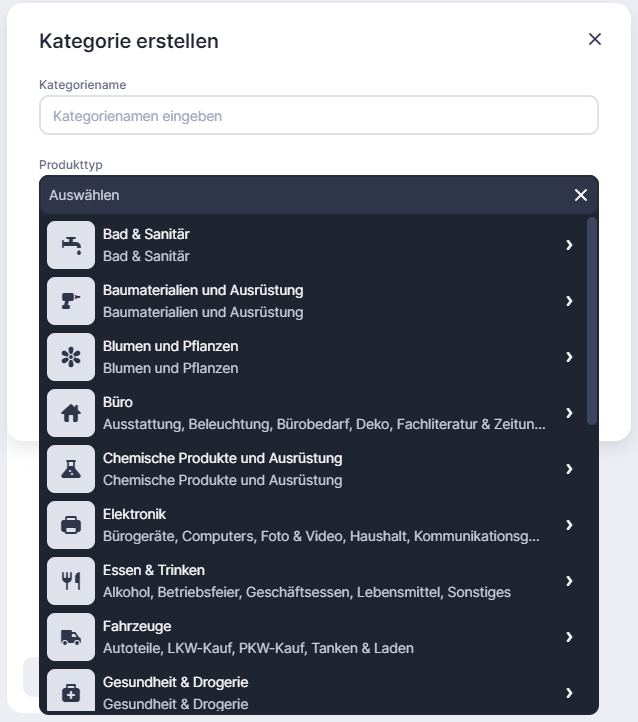 Wähle einen Produkttyp aus und er wird automatisch für alle Produkte in dieser Kategorie verwendet.