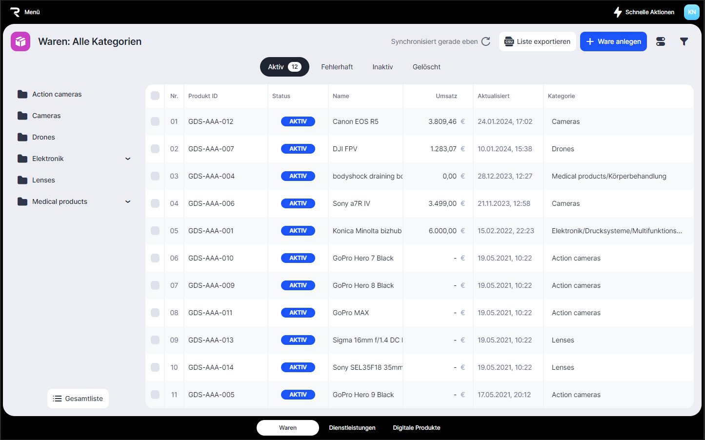 Kategorie: Je nach ausgewählter Kategorie siehst du eine Reihe von Attributen, die für die Ware dieser Kategorie geeignet sind. Du kannst diese Attribute hier einrichten. Produkttyp ist für die korrekte Buchführung erforderlich. Mit dem Produkttyp definiert Runple das Sachanlagen-Konto und weitere Buchhaltungseigenschaften des Produkts, die für den Buchhaltungsexport erforderlich sind.