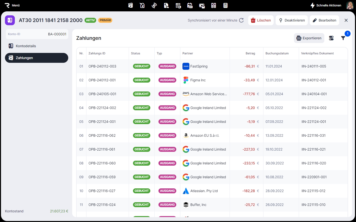 Im Bereich Zahlungen findest du die gebuchten Zahlungen mit dem ausgewählten Bankkonto.