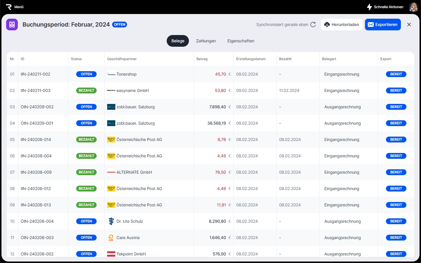 Das Archiv enthält CSV-Dateien zum Import in das Buchhaltungssystem, PDF-Dateien von Eingangs-/Ausgangsrechnungen, Gutschriften und eine Liste der gebuchten Zahlungen.