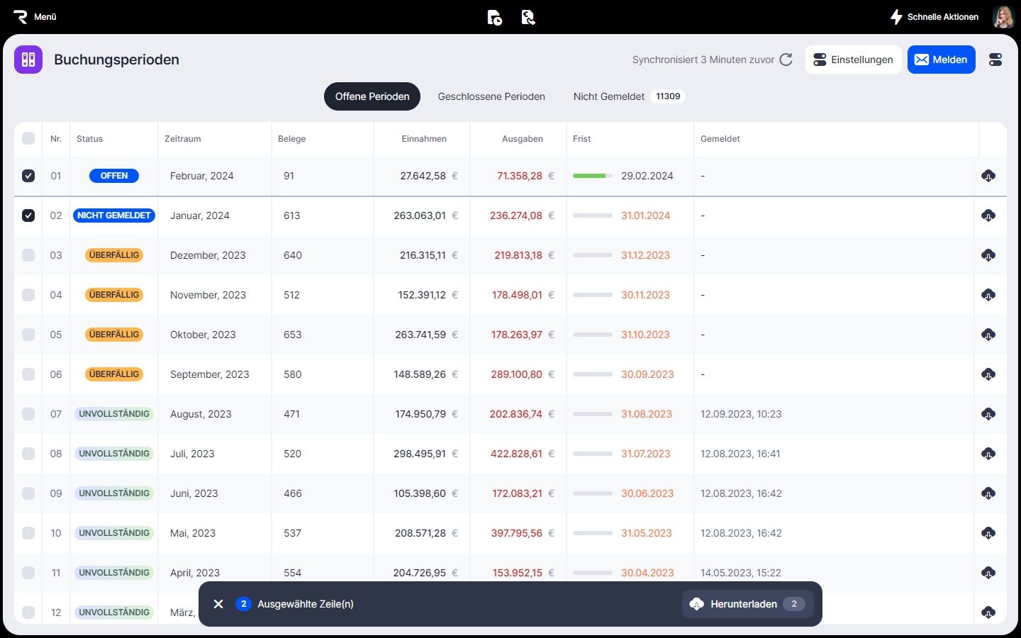 Du kannst ein Archiv mit Buchhaltungsunterlagen für den ausgewählten Zeitraum herunterladen.