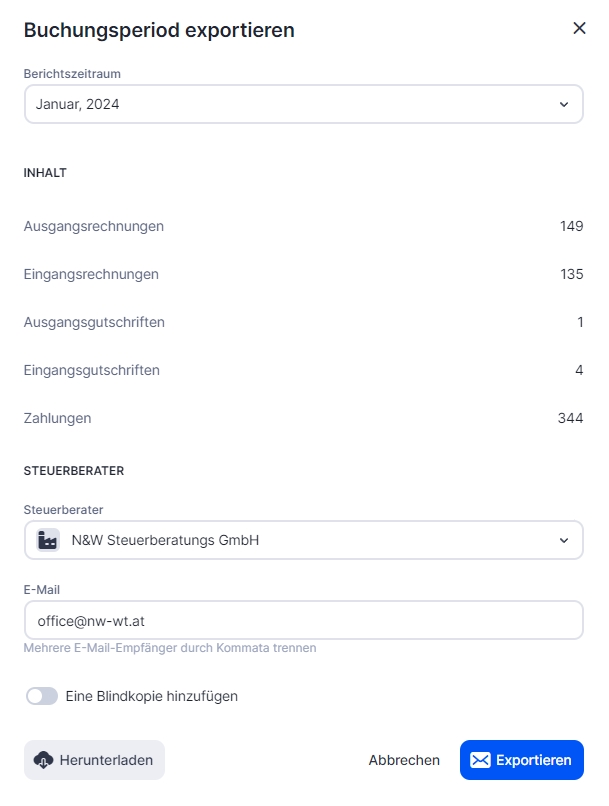 Dein Steuerberater erhält eine E-Mail mit einem Link zum Archiv mit deinen Buchhaltungsdaten für den ausgewählten Buchungszeitraum.