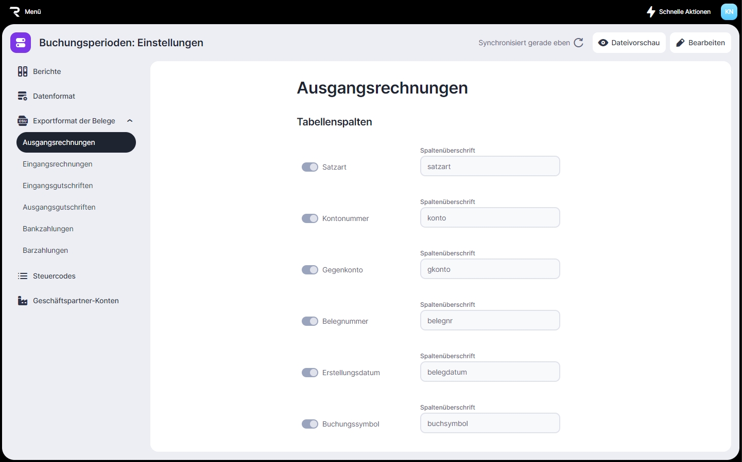 Du kannst die Menge der in der Exportdatei enthaltenen Spalten, ihre Reihenfolge und die Namen in der Exportdatei einrichten.