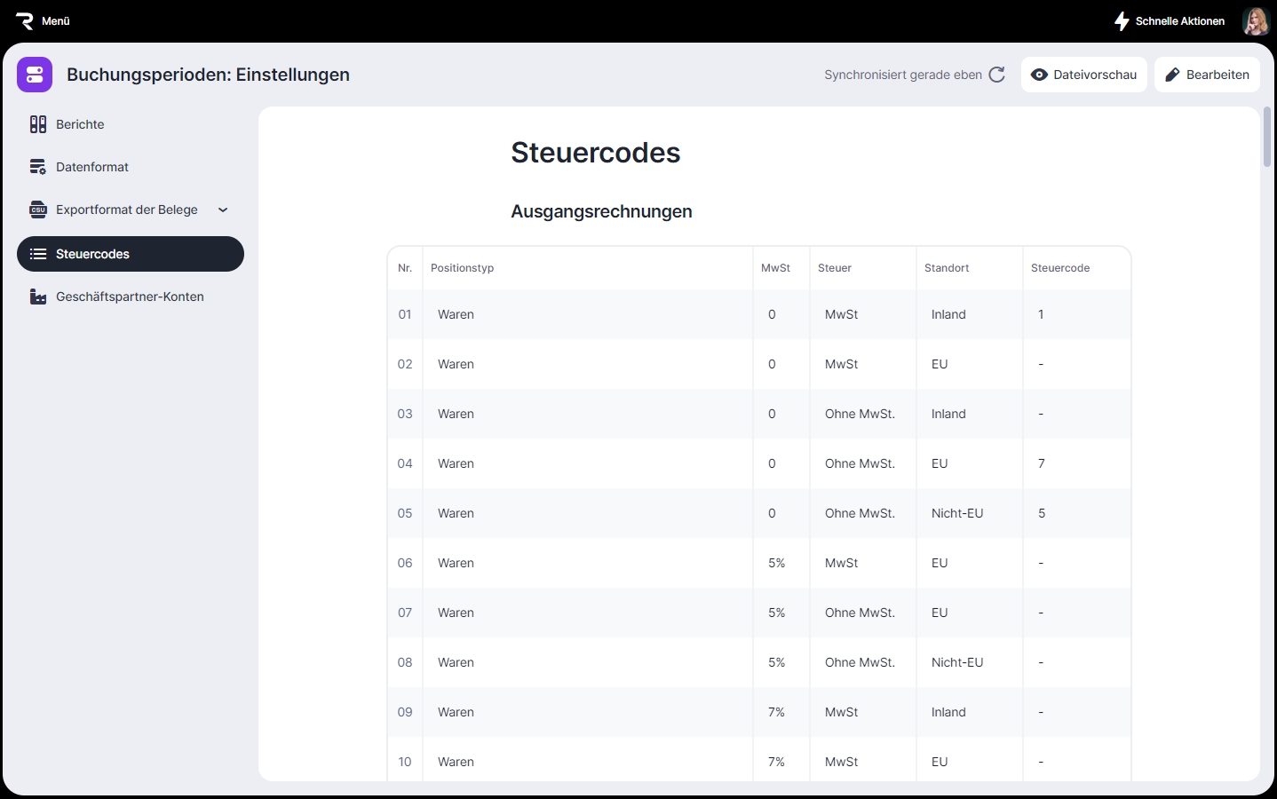 In diesem Bereich kannst du Steuercodes angeben, die für Positionen in Buchhaltungsbelegen und im Buchhaltungsexport verwendet werden.