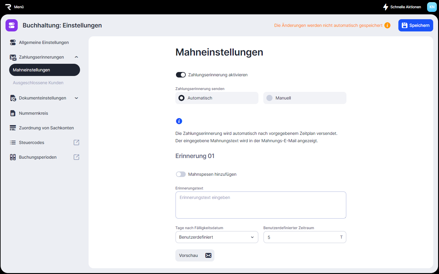 5. Richte Mahnspesen, Mahnungstext und Zeitplan ein.