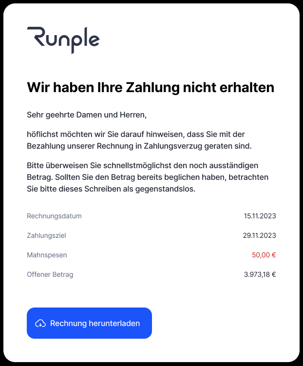 Dieser Text erscheint in der E-Mail mit der überfälligen Mahnung, die dein Kunde erhält.