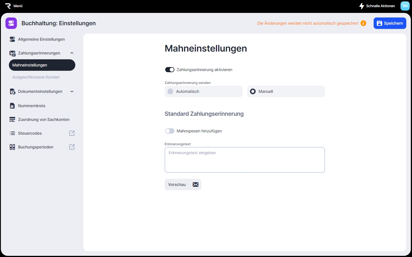 Sobald du die Mahnspesen aktiviert hast, kannst du die Spesenart wählen: einen festen Betrag oder einen Prozentsatz vom offenen Betrag.