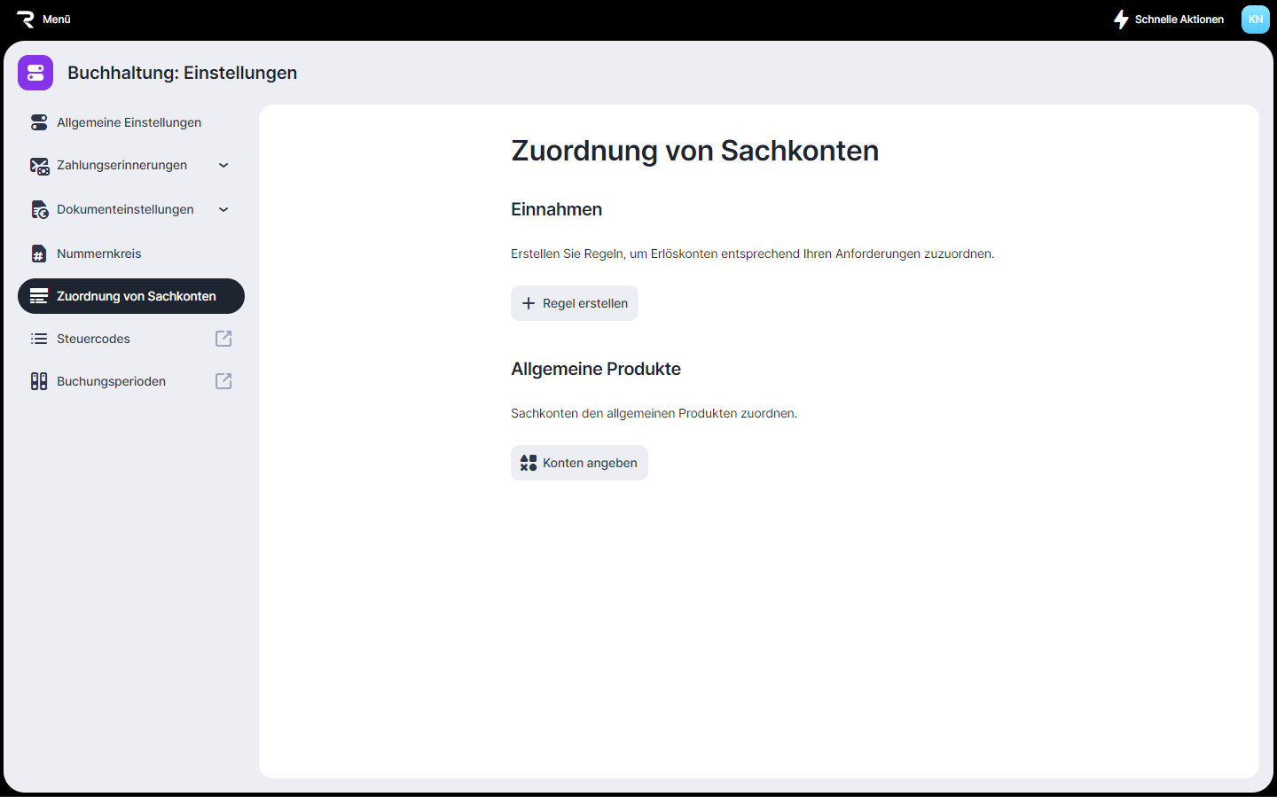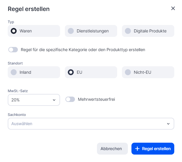 Du kannst Regeln für die Zuweisung der Erlössachkonten erstellen. Du kannst ein Erlöskonto pro Standort, Produkt, Kategorie oder Mehrwertsteuersatz definieren.