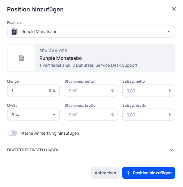 Der Abrechnungszeitraum wird automatisch nach der Formel Von-Datum + Zahlungsfrequenz berechnet. Dieser Zeitraum wird bei der Erstellung der Rechnung in den Positionen verwendet.