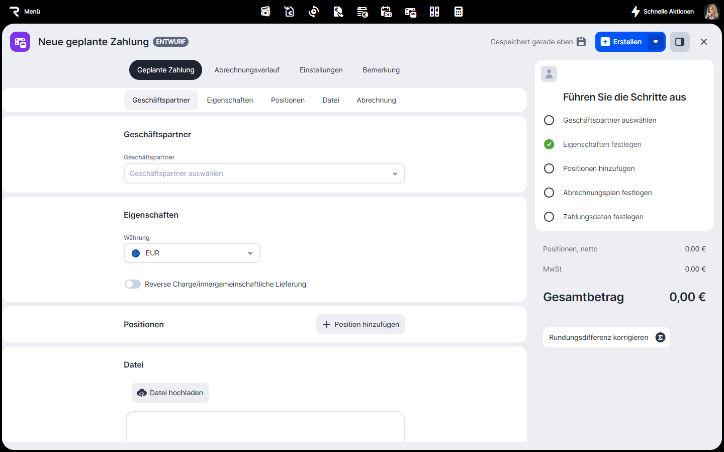 Die Rechnung wird mit dem Status "Entwurf" im ersten Zahlungsdatum erstellt.