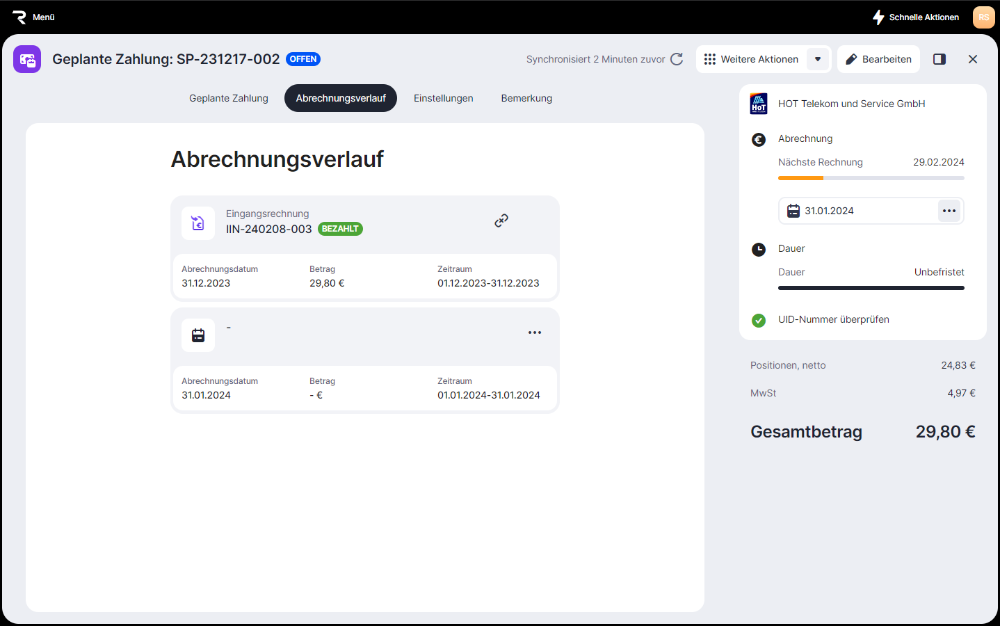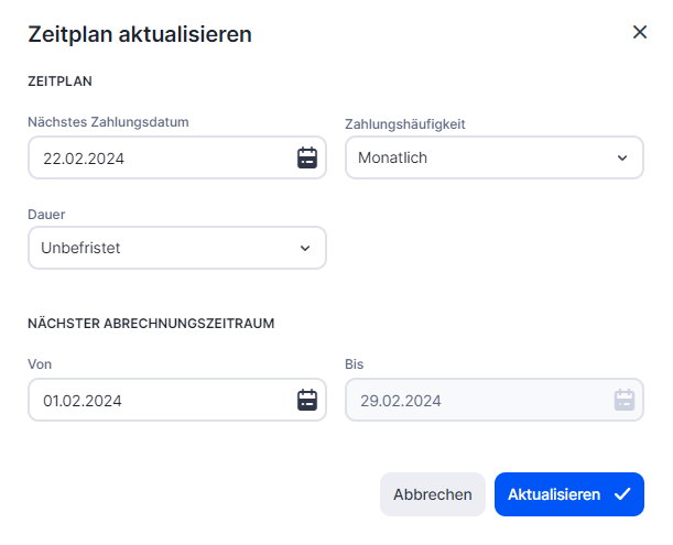 Bei der geplanten Zahlung werden Zeiträume festgelegt, für die je nach Einstellung automatisch oder manuell Rechnungen erstellt werden.