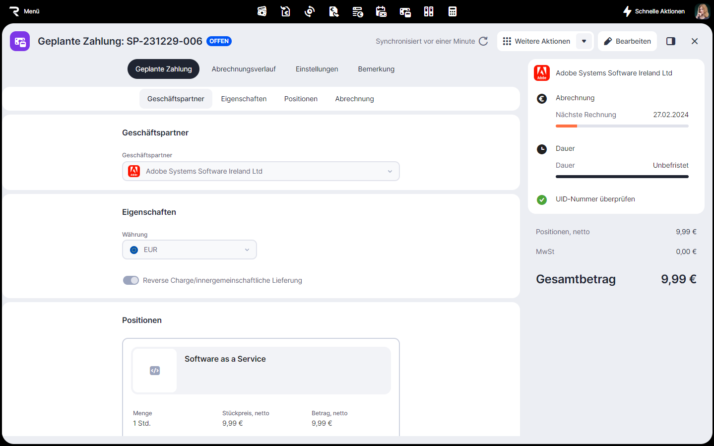 Bitte beachte, dass du den Geschäftspartner oder die Währung nicht ändern kannst, wenn Rechnungen oder Zahlungen mit der geplanten Zahlung verknüpft sind.