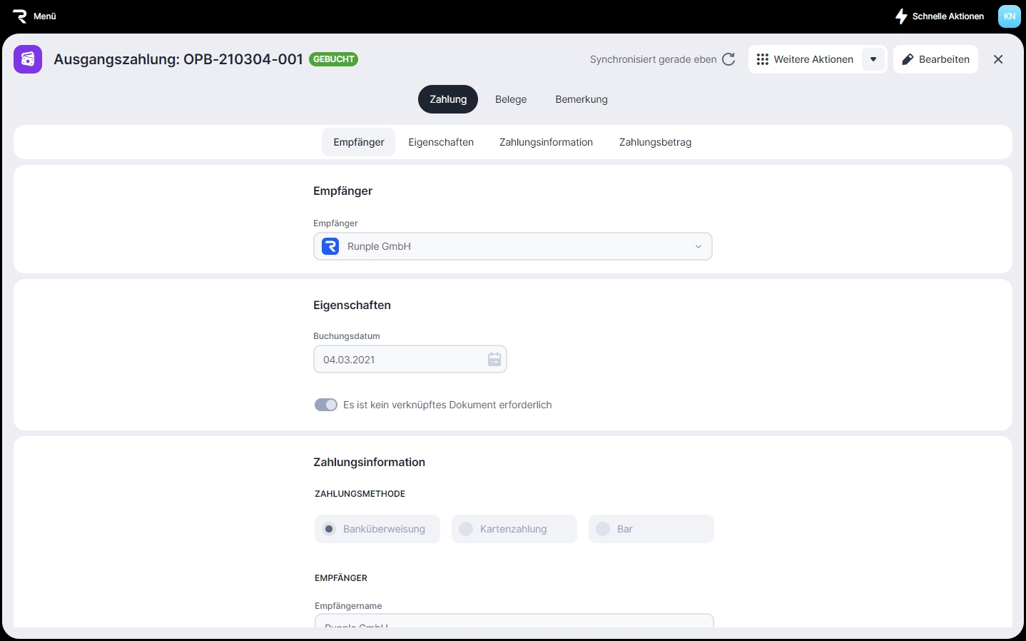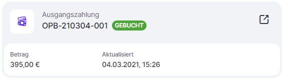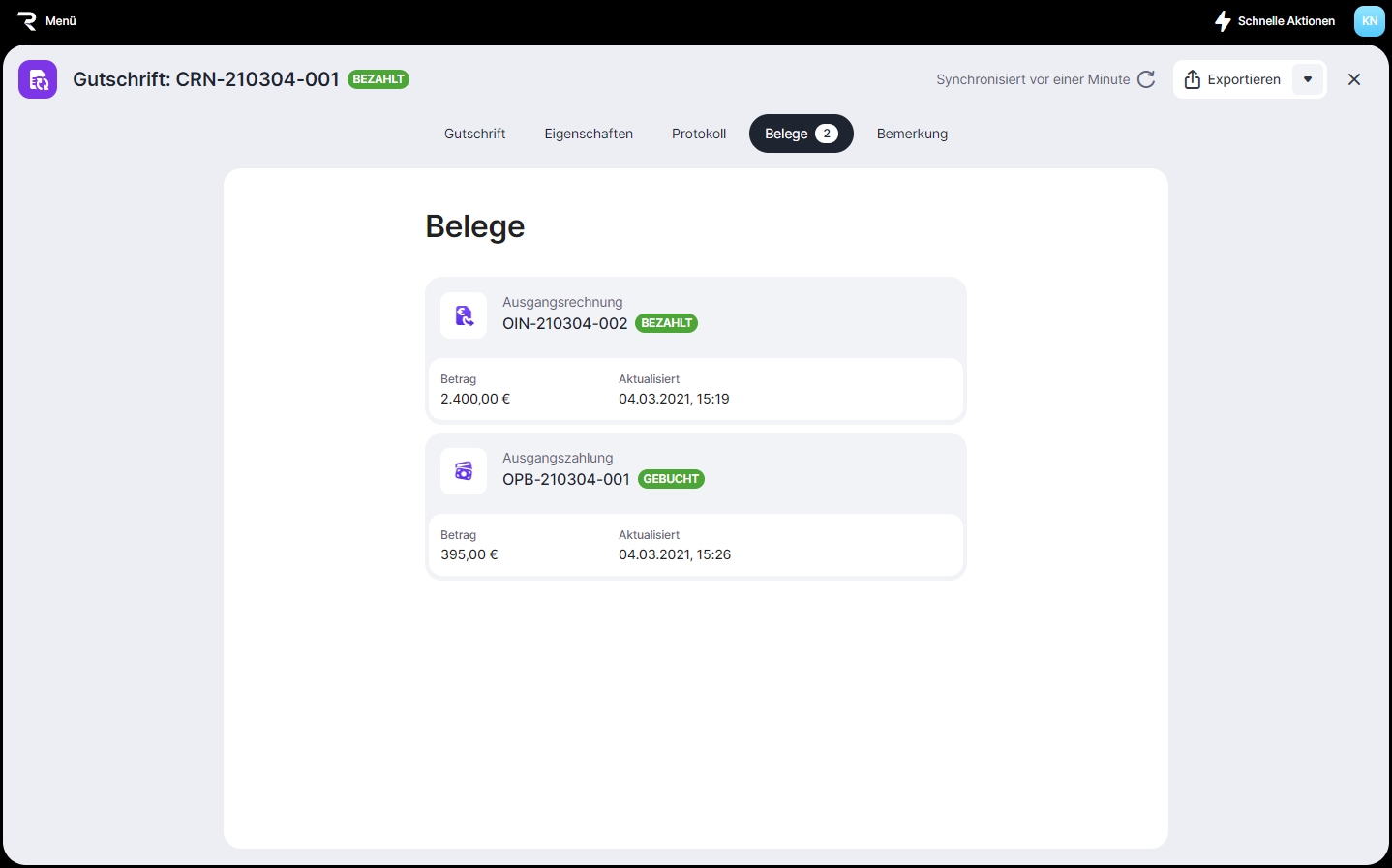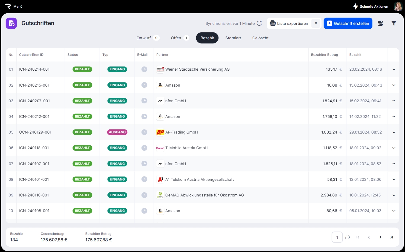 Nach der Stornierung der Zahlung wird der Status der Gutschrift auf Offen geändert.