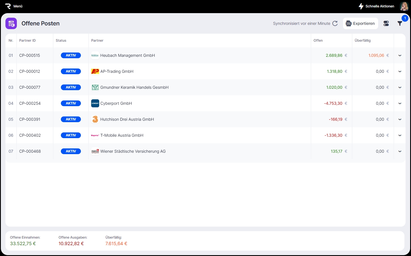 In der Offene Posten Liste werden die offenen Verpflichtungen zwischen dir und deinen Partnern auf Grund der offenen Rechnungen und Gutschriften angezeigt.