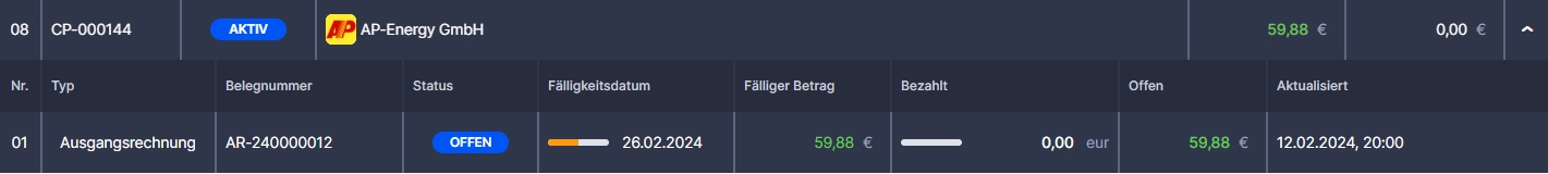 Offene Posten sind nach Geschäftspartnern gruppiert. Du kannst auf die Zeile klicken, um die Liste der offenen Dokumente für den ausgewählten Partner anzuzeigen.