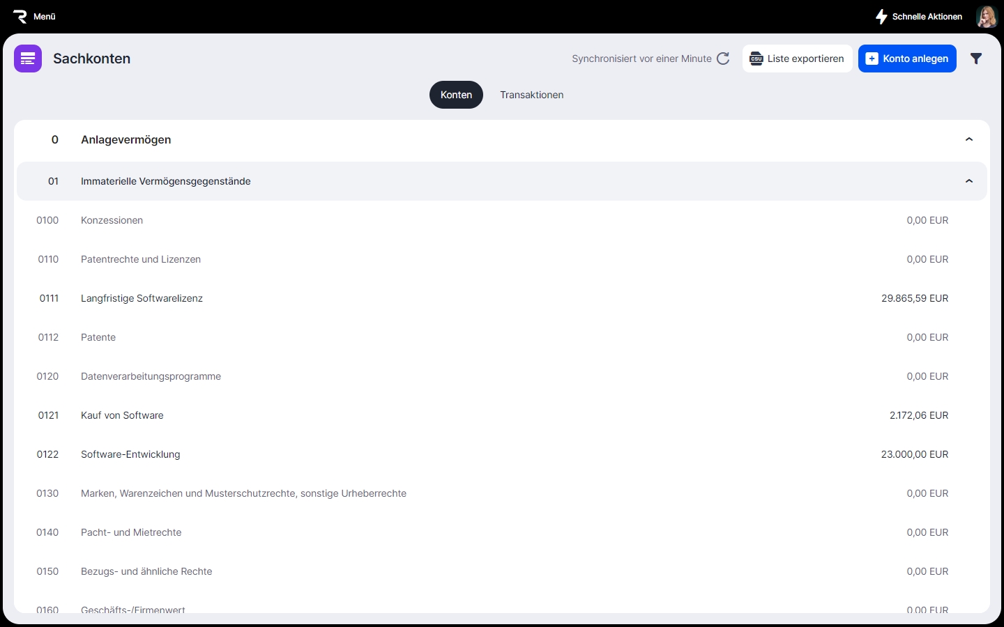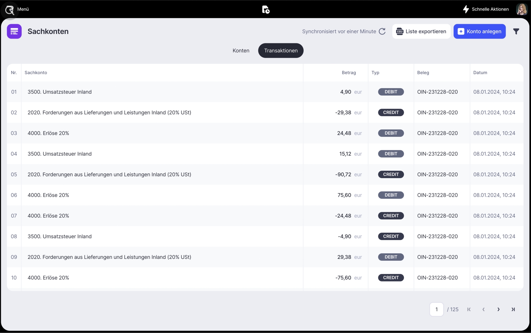 Die Liste der Transaktionen zeigt eine vollständige Liste der Sachkonto-Transaktionen.