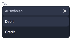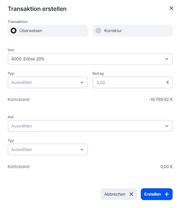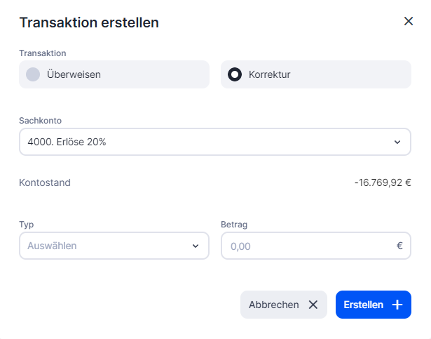 Wähle das Sachkonto, den Typ und gib den Betrag ein, um den du den Saldo dieses Kontos korrigieren möchtest.