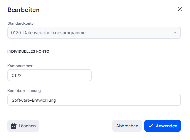 Wenn du das benutzerdefinierte Konto bearbeitest, kannst du auch den Kontocode ändern oder das Konto löschen.