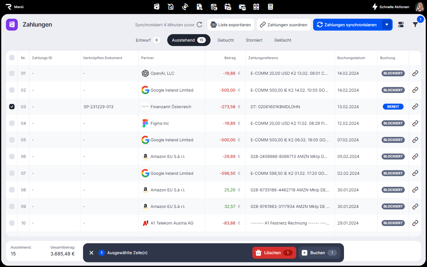 4. Die Zahlungen im Status "Ausstehend" wählen und klicke Buchen. ![]()