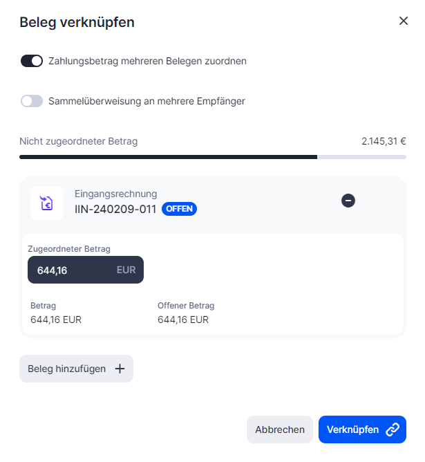 2. Aktiviere die Option Zahlungsbetrag mehreren Belegen zuordnen.
