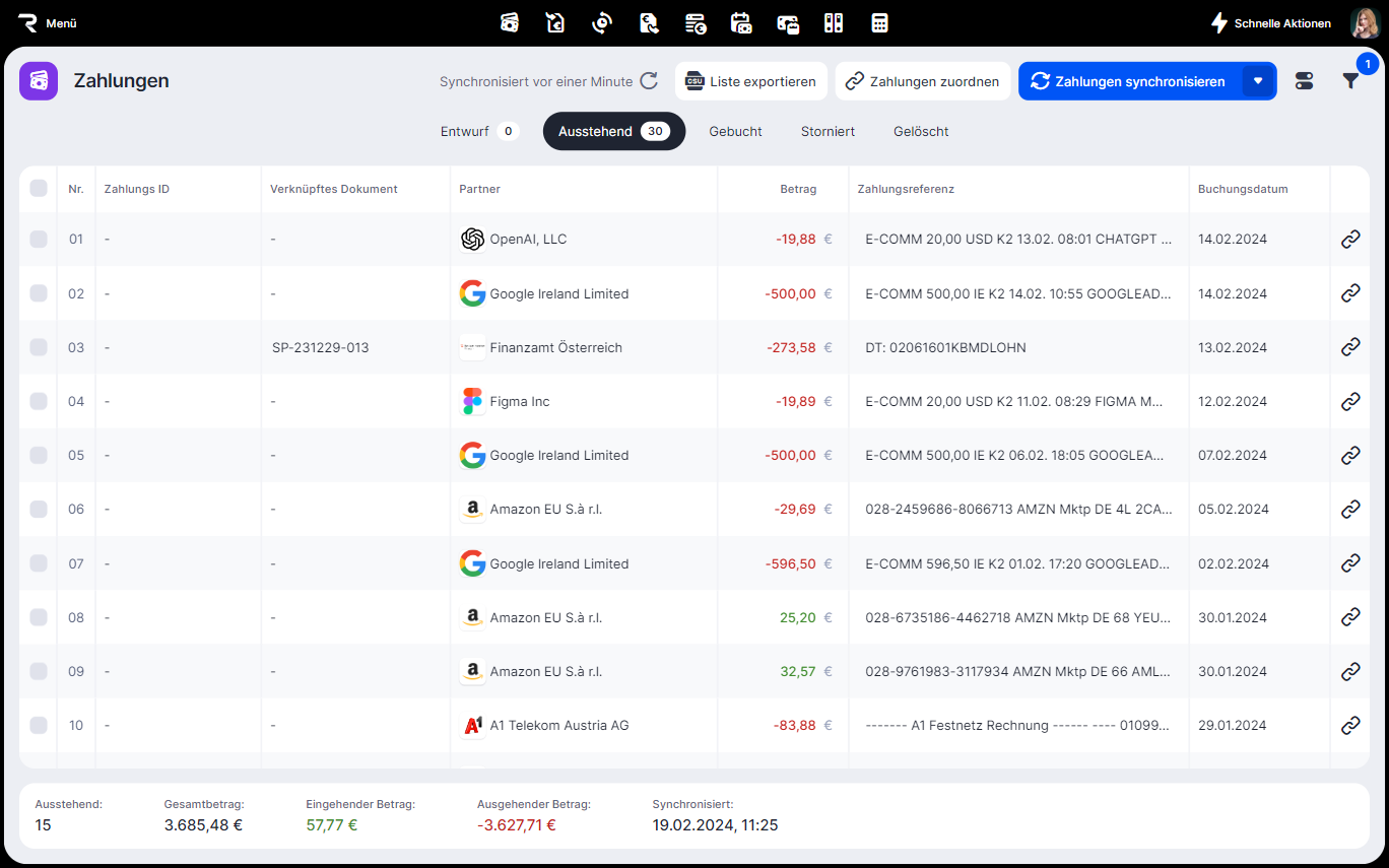 Sobald die Zahlungen synchronisiert sind, musst du die ausstehenden Zahlungen mit den Rechnungen verknüpfen.