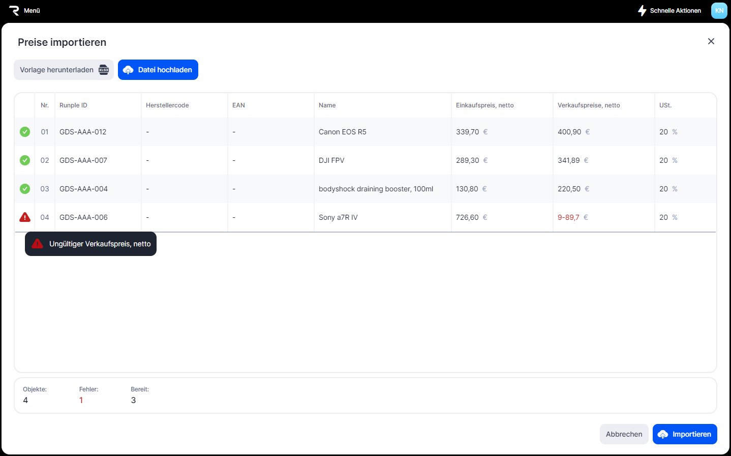 Bevor du Preise importieren kannst, müssen Produkte in Runple bereits vorhanden sein. Du kannst Produkte manuell anlegen oder importieren.