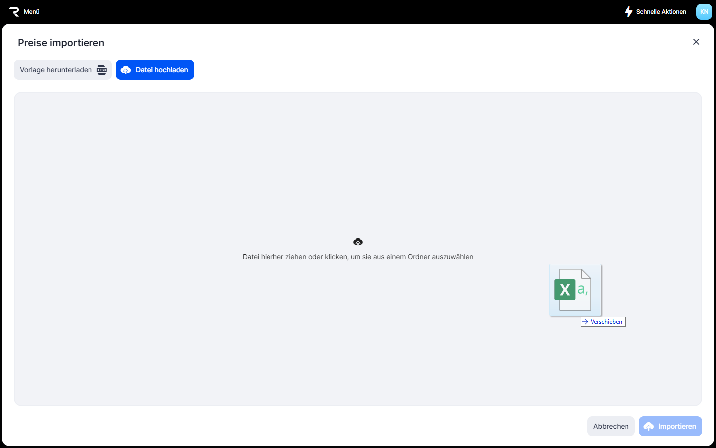 Du kannst die Datei in das Datenimportfenster ziehen oder Datei hochladen klicken