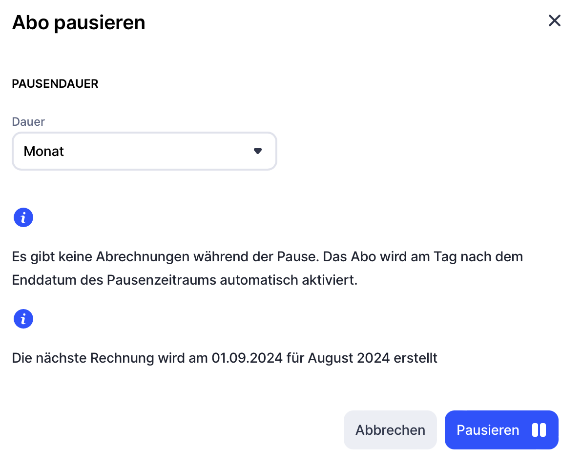 Du kannst dein Abo pausieren, um die Rechnungserstellung zu stoppen.