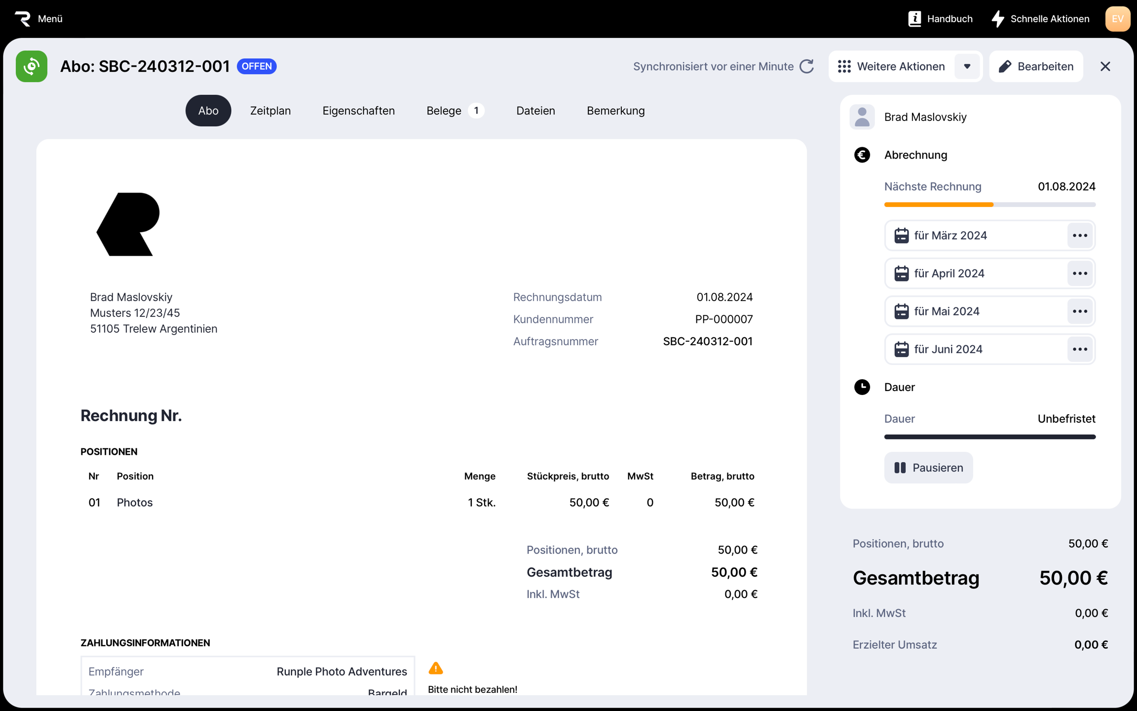 Rechnungen für Abos werden automatisch erstellt, und du kannst die Rechnungshistorie einsehen, indem du den Tab Belege öffnest.