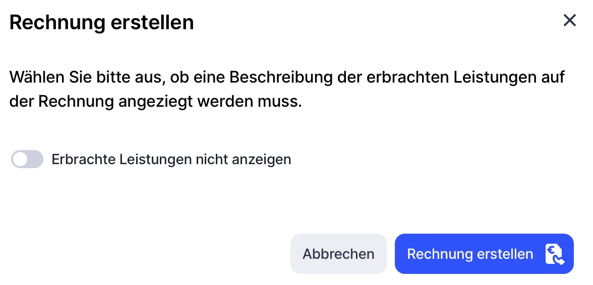 5. Aktiviere die Option Erbrachte Leistungen nicht anzeigen, wenn du die bei der Zeiterfassung angegebene Beschreibung nicht anzeigen möchtest.