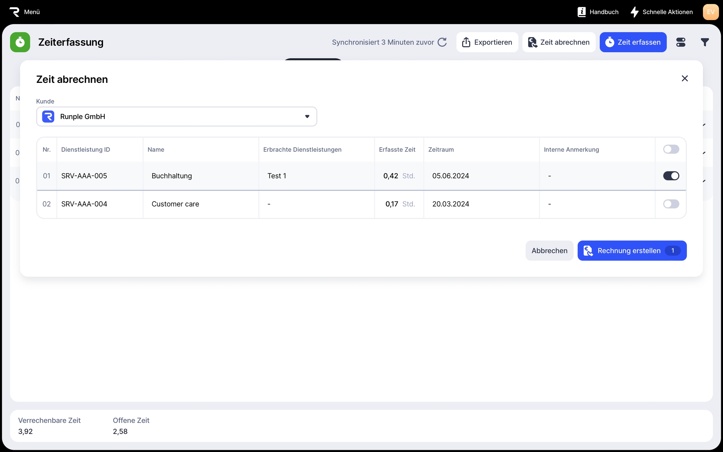Rechne die Zeit für einen Partner ab, indem du die Datensätze auswählst, die du abrechnen möchtest.