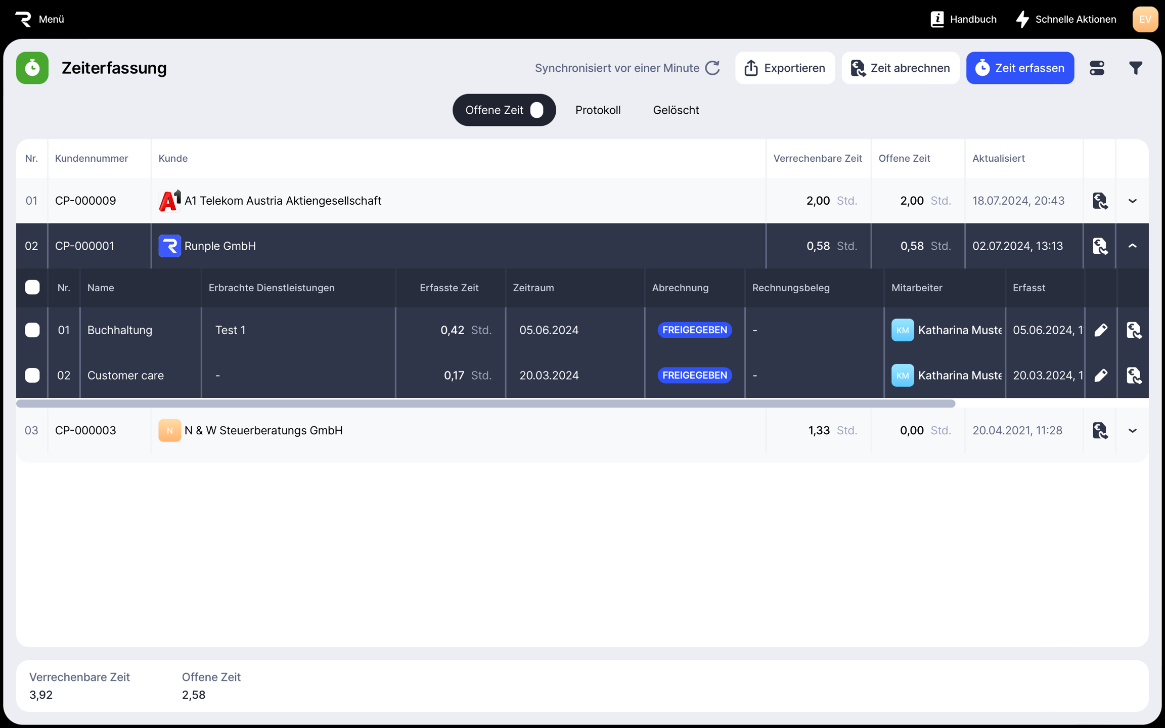 Klick den Pfeil am Ende der Zeile, um die Liste der noch nicht abgerechneten Zeiten für den Partner anzuzeigen.