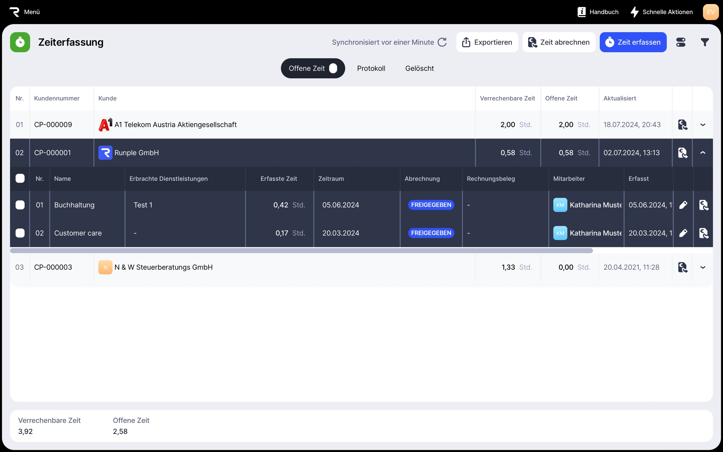 Hier findest du eine Liste von Kunden mit erfasster, aber nicht abgerechneter Zeit.