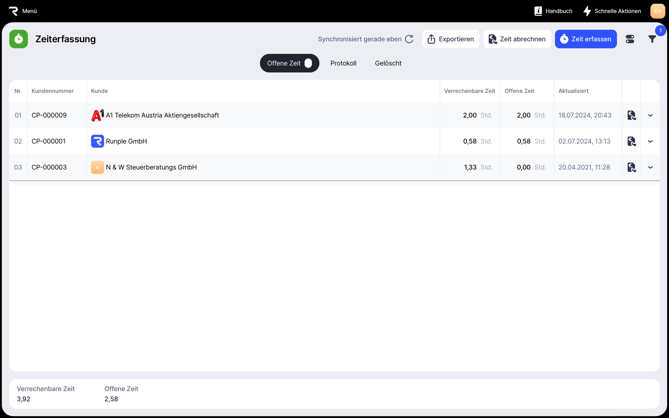 Wenn du 10 Minuten erfasst hast und auf 15 Minuten aufrundest, werden 15 Minuten erfasst.