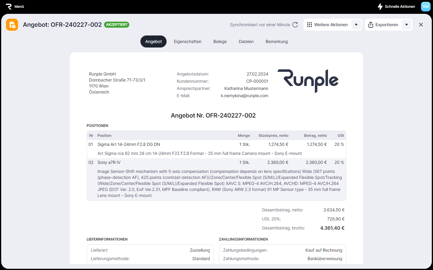 Klick Duplizieren, um ein neues Angebot mit denselben Informationen und Positionen zu erstellen.