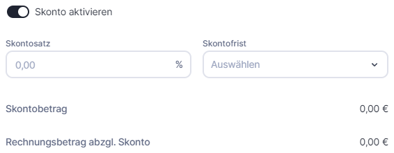 Sobald du das Skonto aktiviert hast, musst du den Skontosatz und die Skontofrist angeben.