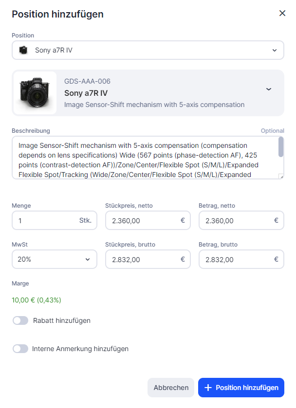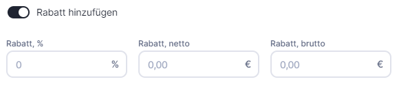Aktiviere die Option Rabatt hinzufügen, um einen Rabatt für die Position anzugeben.