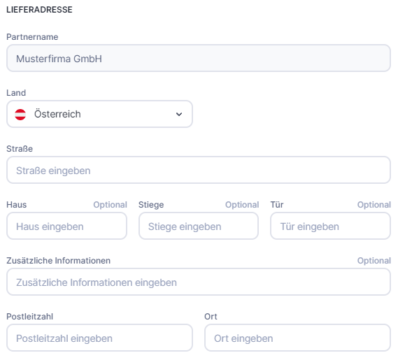 Du musst die Lieferadresse nur dann manuell angeben, wenn du den Allgemeinen Geschäftspartner ausgewählt hast oder der bestehende Kunde keine Lieferadresse im Profil hat.