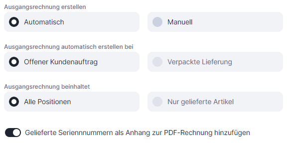 Wähle Offener Kundenauftrag, wenn du möchtest, dass eine Rechnung automatisch erstellt wird, sobald ein Kundenauftrag erstellt wurde.