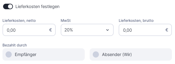 Wähle Empfänger, wenn du möchtest, dass dein Kunde die Lieferkosten übernimmt. In diesem Fall werden die Lieferkosten im Angebot angezeigt und als zusätzliche Position zur Rechnung hinzugefügt.