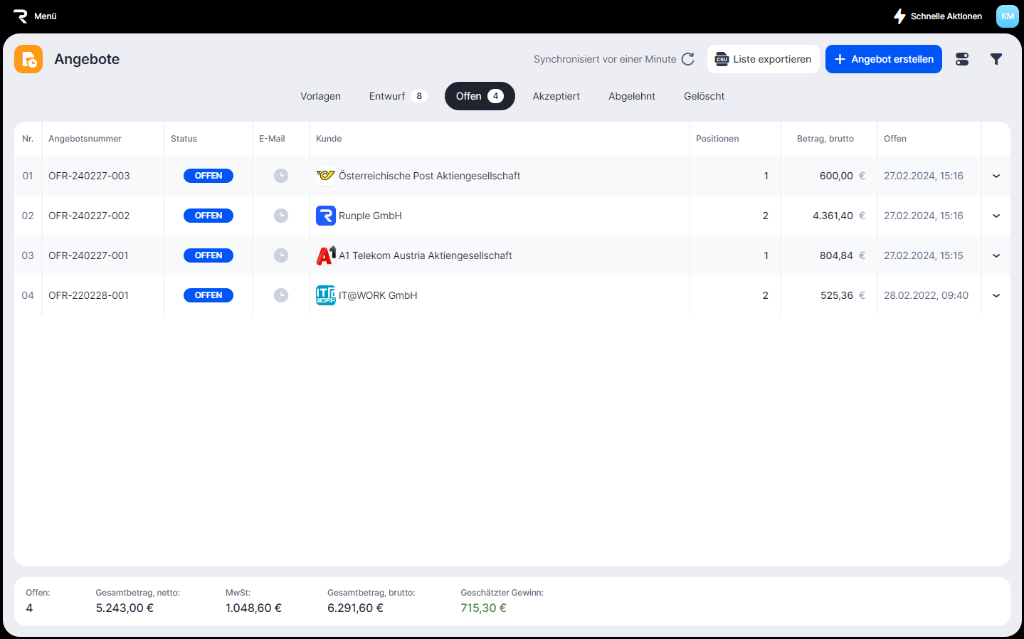 In der Spalte E-Mail wird der Status der Angebots-E-Mail angezeigt.