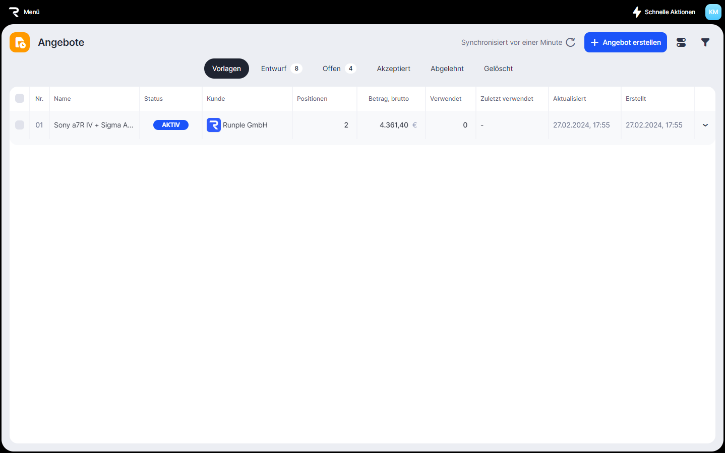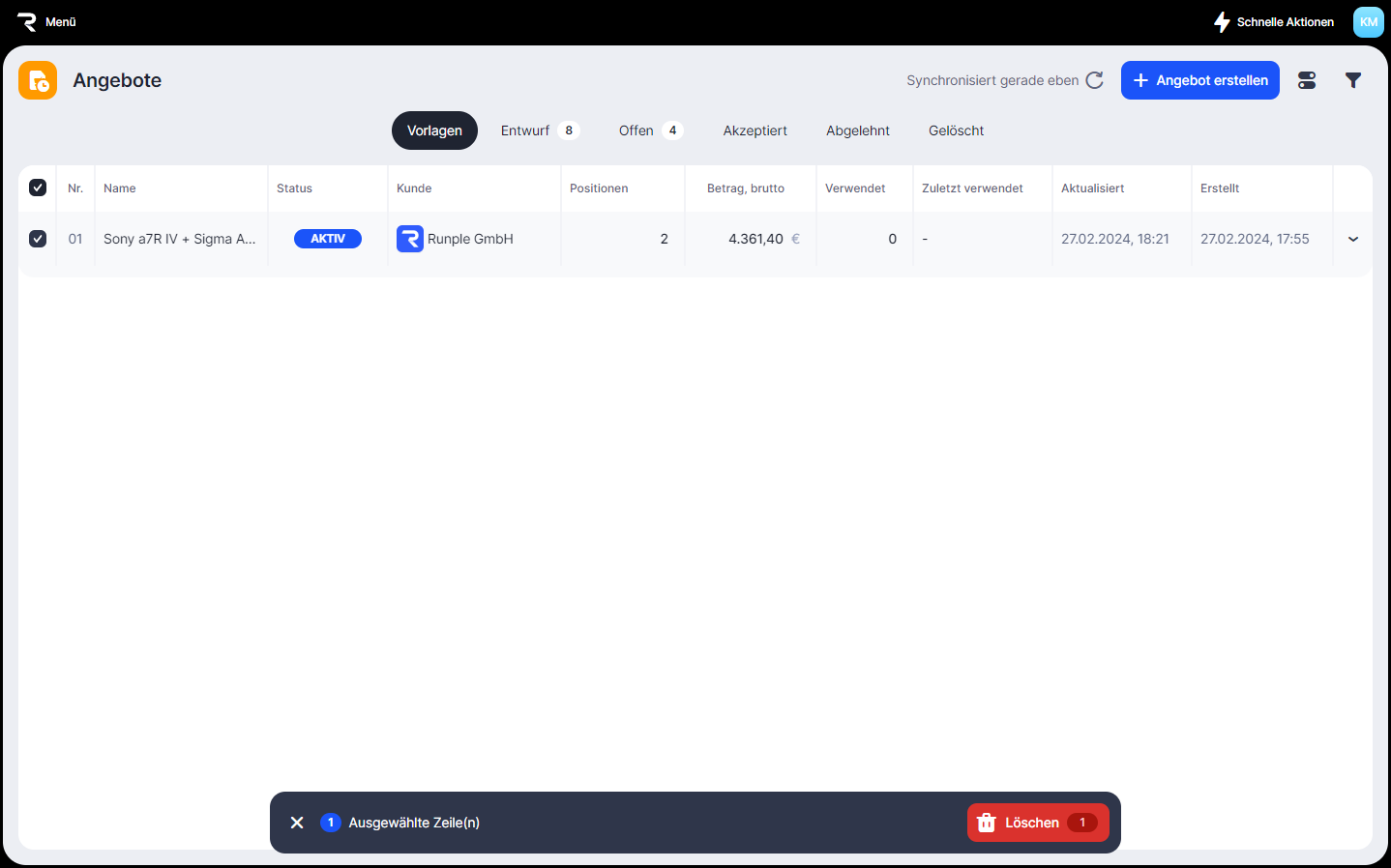 Hier kannst du zwischen deinen Vorlagen, Entwürfen, offenen, akzeptierten, abgelehnten und gelöschten Angeboten navigieren.