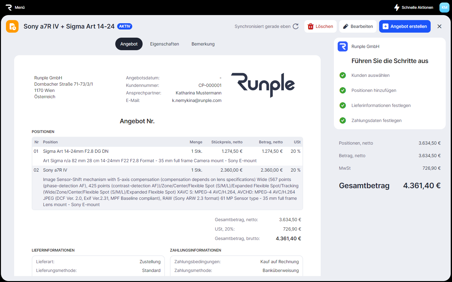 Die blaue Mail zeigt an, dass die Angebots-E-Mail gesendet wurde.