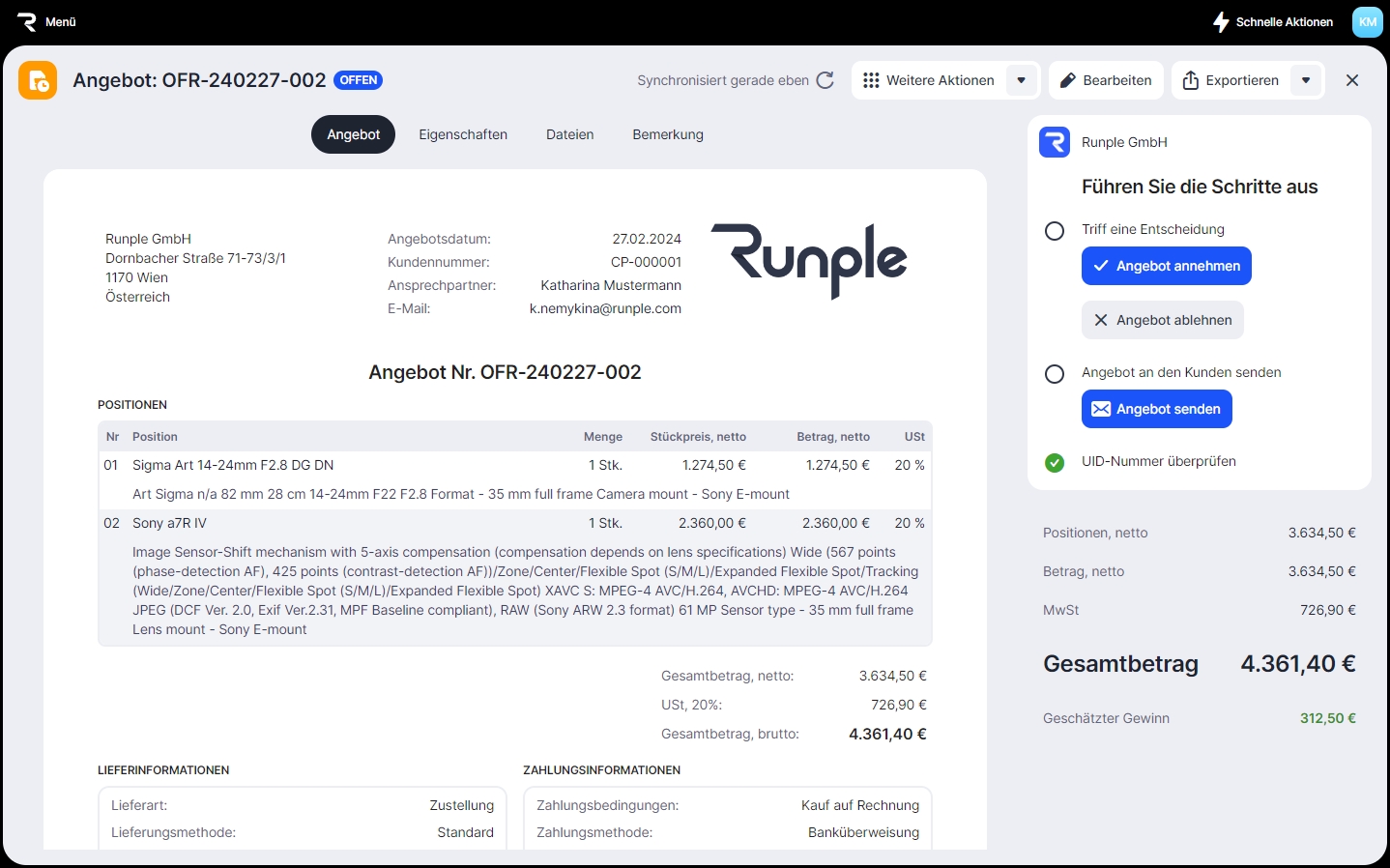 Du kannst das Angebot für deinen Kunden annehmen oder ablehnen.