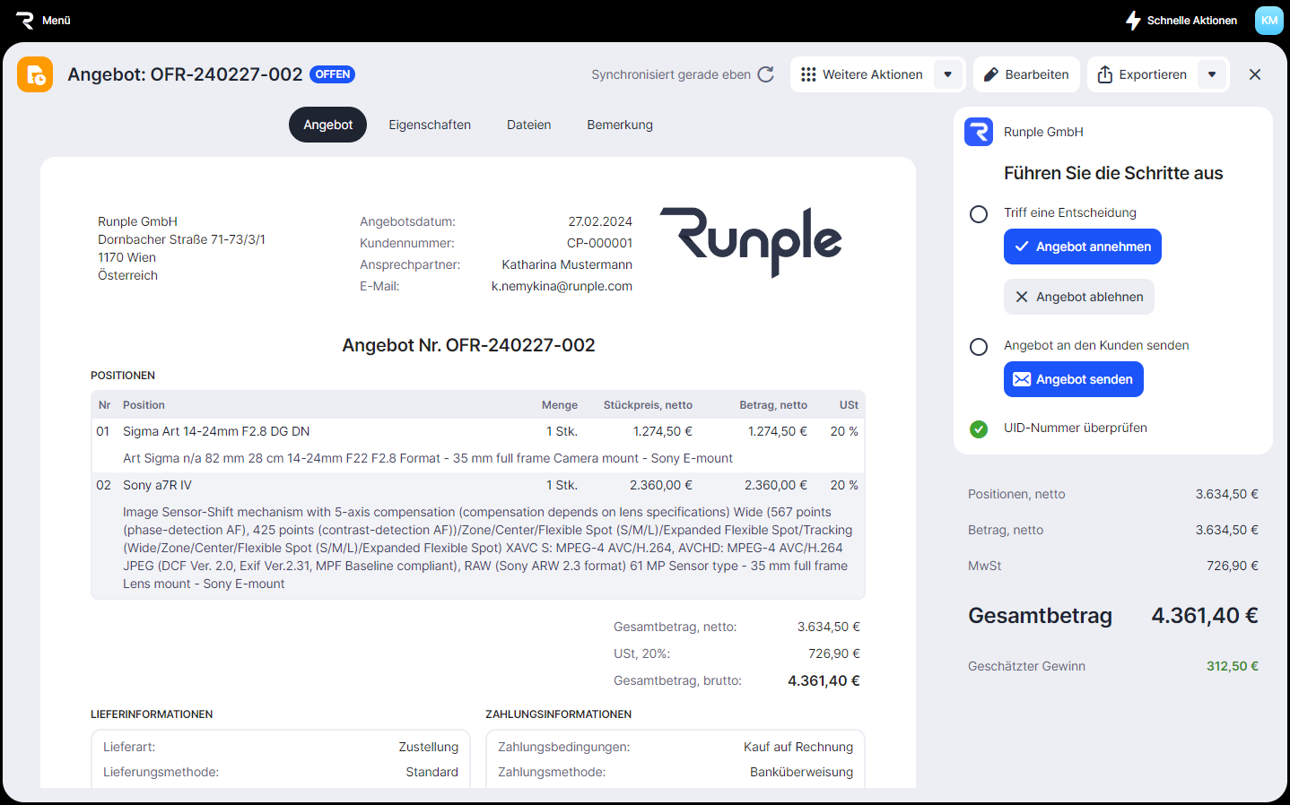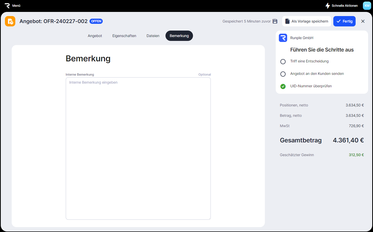 Du kannst den Angeboten eine interne Bemerkung hinzufügen.