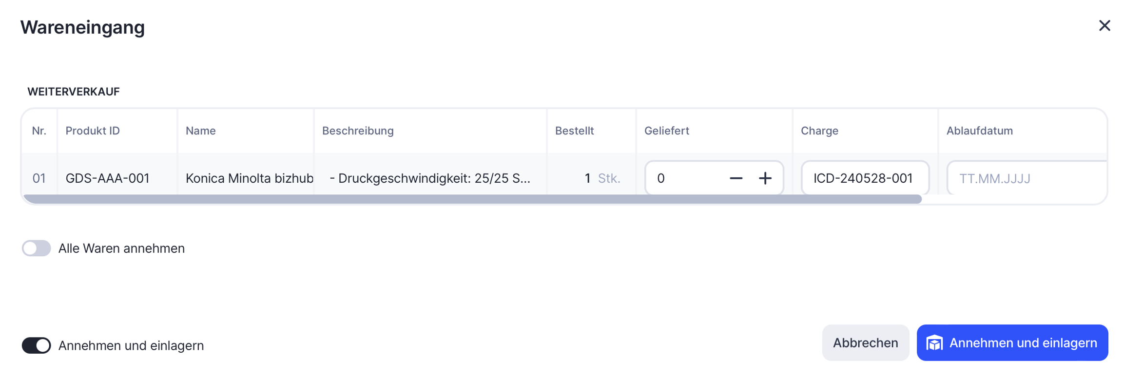 Aktiviere die Option Alle Waren annehmen, um den Wareneingang für alle bestellten Waren zu bestätigen.