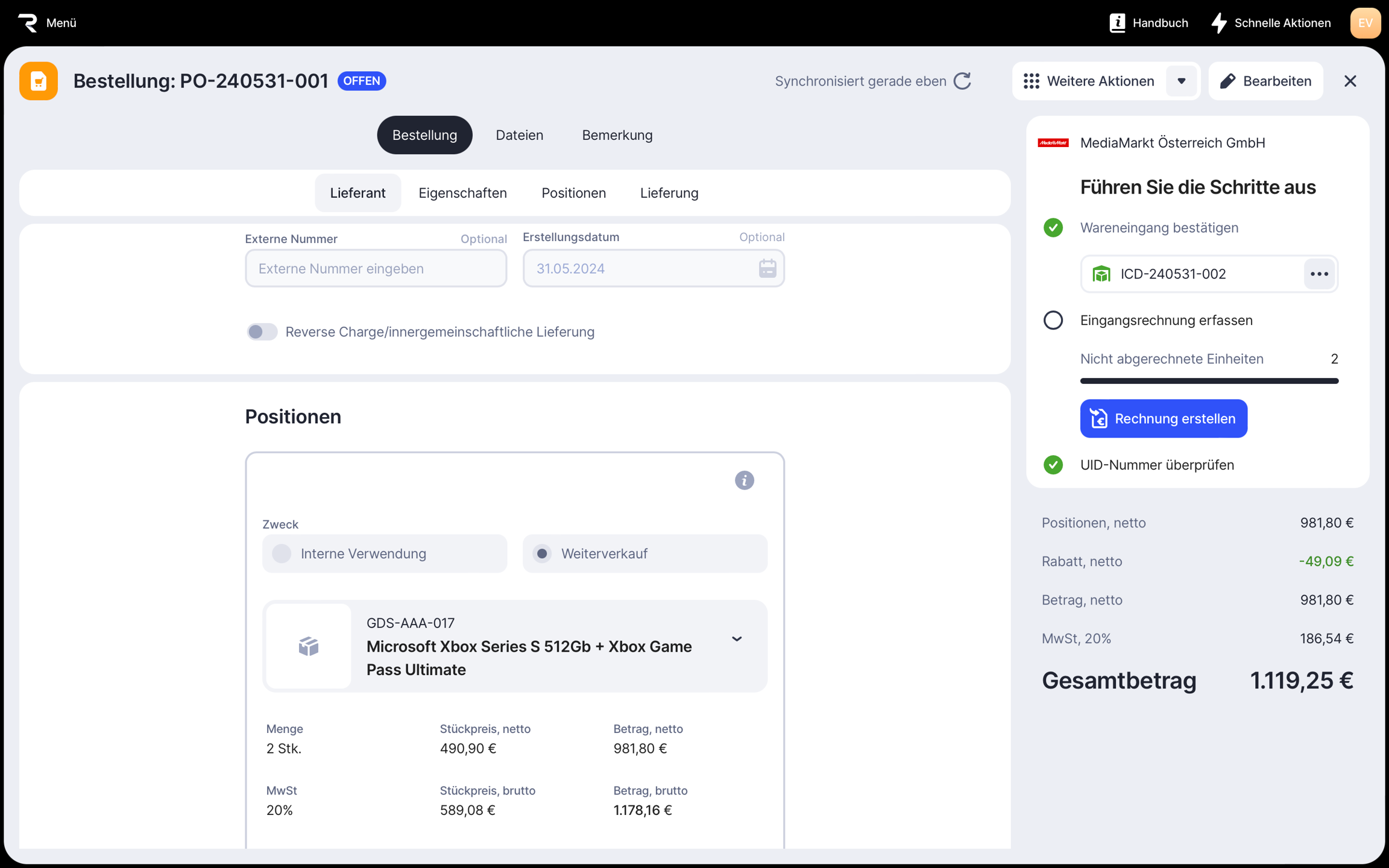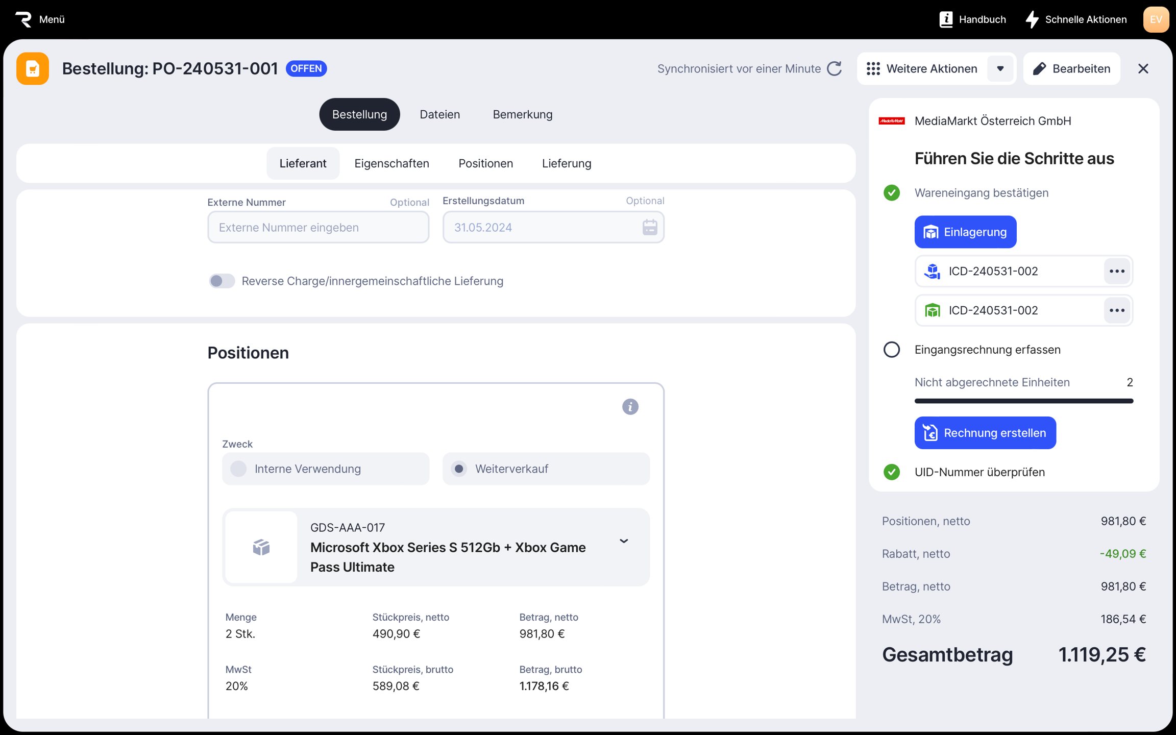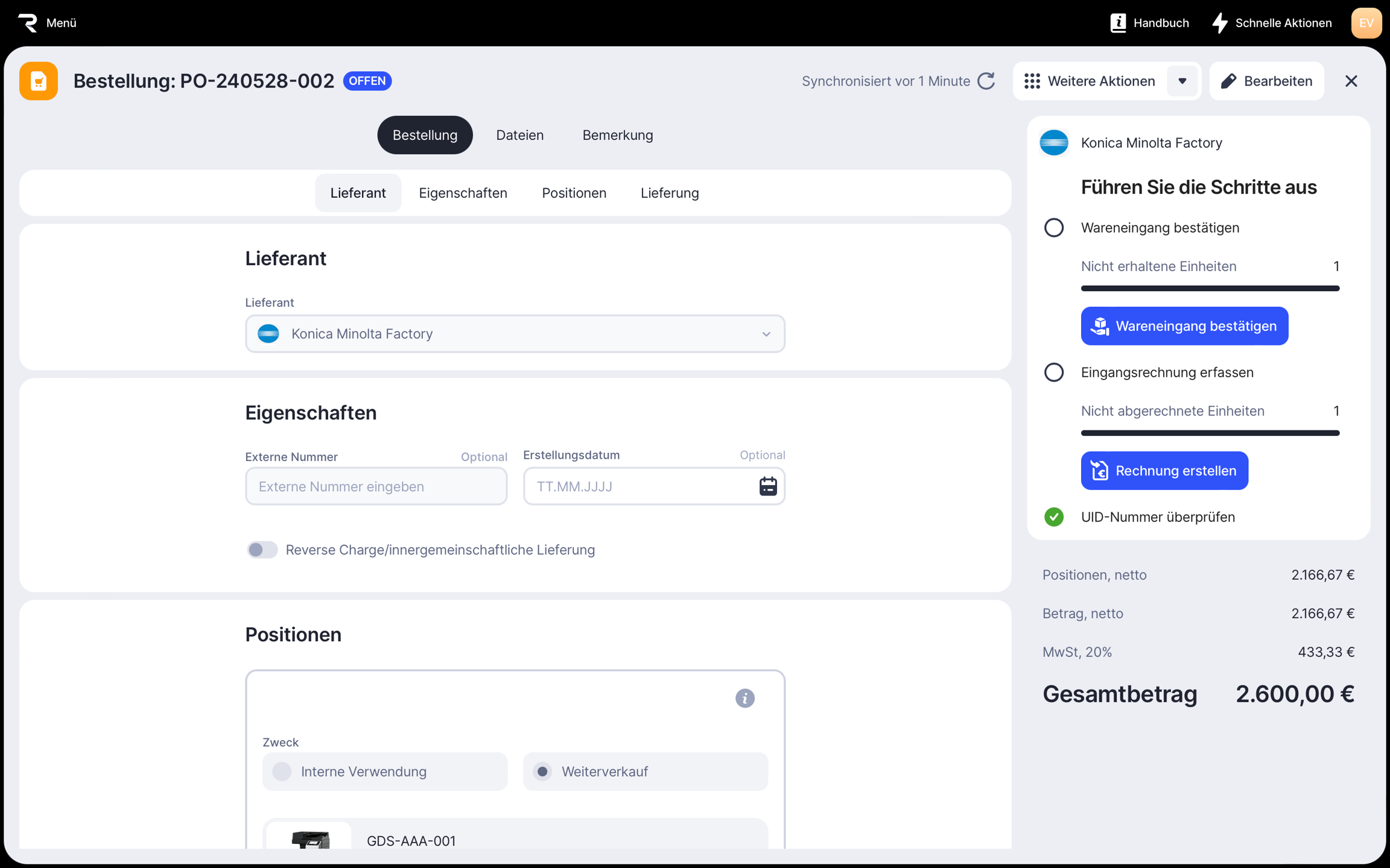 Sobald eine Bestellung den Status Offen erhält, musst du den Wareneingang bestätigen und eine Eingangsrechnung erstellen.